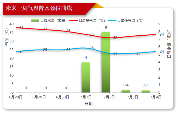 7月3日晚上到4日白天:多云间晴有分散阵雨或雷雨,气温24~34℃。