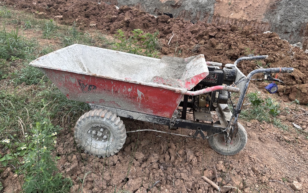 涉及的手扶式三轮运输车停放在土坎边坡下方的田地中,整体结构完好,主要由车架、车斗、发动机及操控部件构成;车斗主体为红色,内部仅表面有少许凝固的砂浆;车斗前部配备发动机,发动机左侧为油门控制装置;两侧设有黑色手柄,手柄上装有刹车等控制装置,车辆左手手把处挂有一个卷尺。
