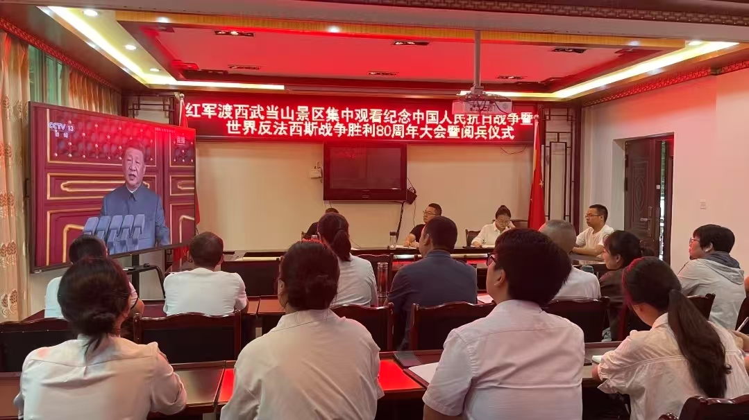 县红军渡西武当山景区事务中心集中观看纪念中国人民抗日战争暨世界反法西斯战争胜利80周年大会实况直播。