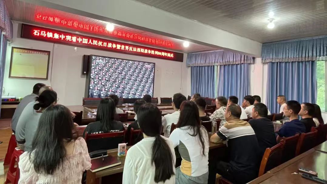石马镇集中观看纪念中国人民抗日战争暨世界反法西斯战争胜利80周年大会实况直播。