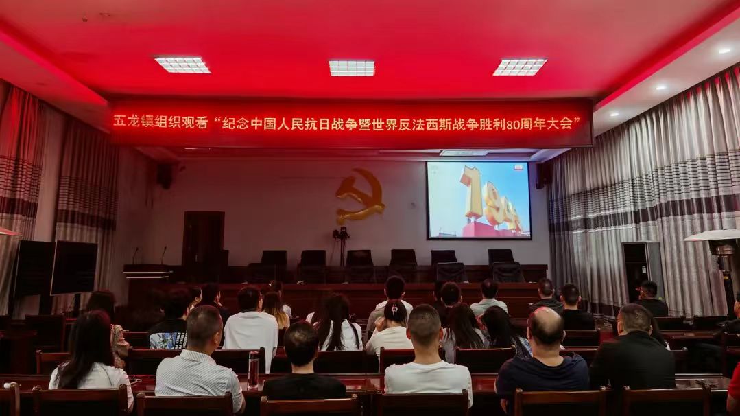 五龙镇集中观看纪念中国人民抗日战争暨世界反法西斯战争胜利80周年大会实况直播。