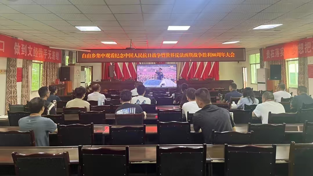白山乡集中观看纪念中国人民抗日战争暨世界反法西斯战争胜利80周年大会实况直播。