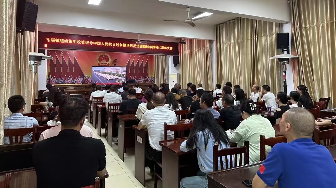 东溪镇集中观看纪念中国人民抗日战争暨世界反法西斯战争胜利80周年大会实况直播。