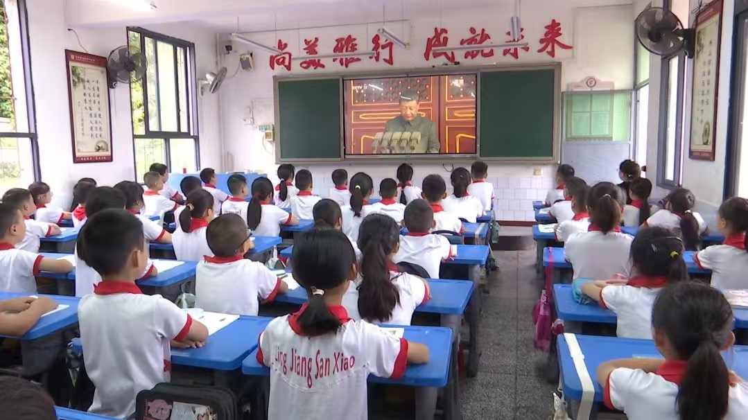 龙王沟小学集中观看纪念中国人民抗日战争暨世界反法西斯战争胜利80周年大会实况直播。