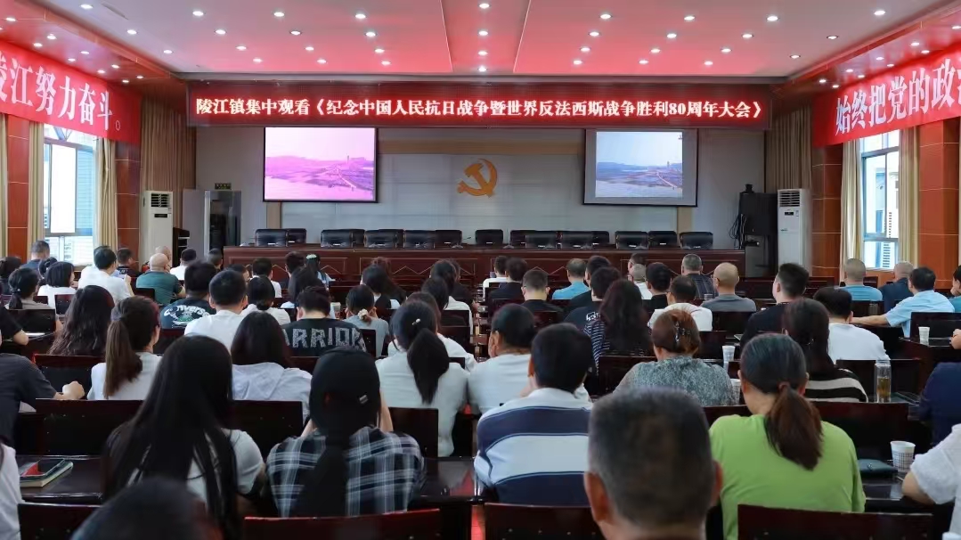 陵江镇集中观看纪念中国人民抗日战争暨世界反法西斯战争胜利80周年大会实况直播。