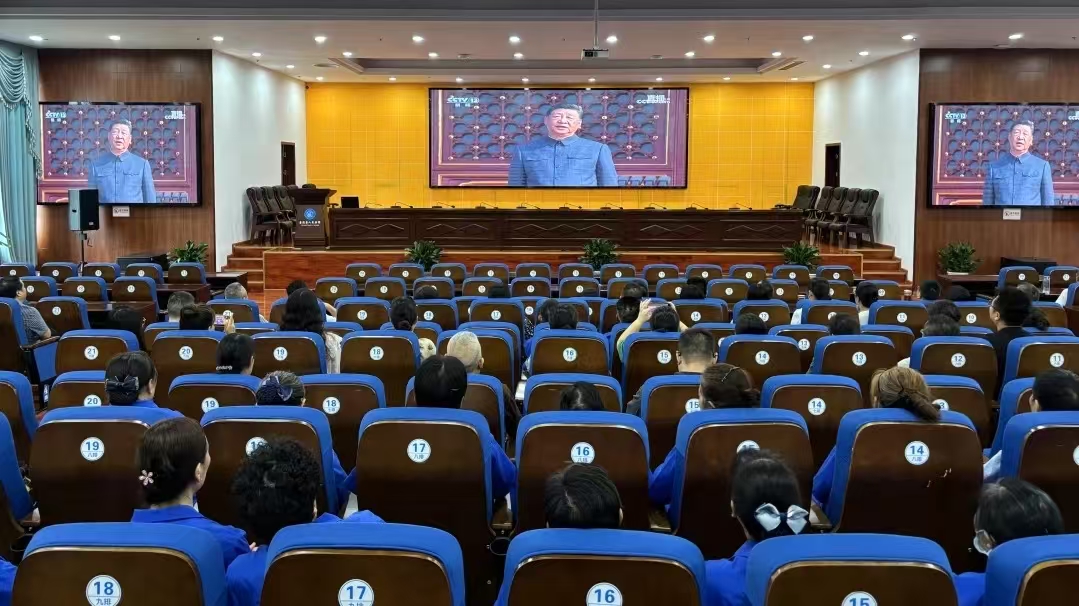 县人民医院集中观看纪念中国人民抗日战争暨世界反法西斯战争胜利80周年大会实况直播。