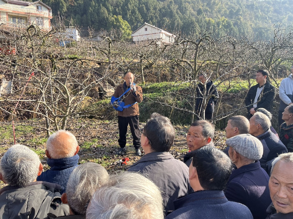 时值寒冬,正是苍溪梨冬季管护的关键时期。12月25日上午,运山镇在龙井村三组举办了2025年“苍溪梨”冬季管理技术培训会,特邀省农科院专家、县农业农村局技术骨干现场授课指导。镇农业综合服务中心全体干部、各村(社区)常职干部、新型经营主体业主、苍溪梨种植大户等100余人齐聚田间课堂,学习苍溪梨冬季管护关键技术,为来年苍溪梨丰产优产筑牢技术根基。