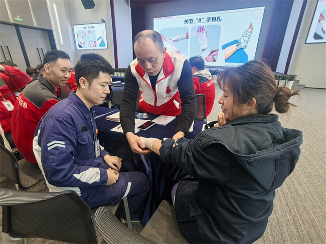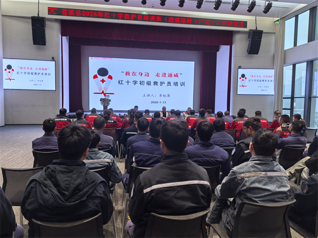 1月13日上午,通威绿材(广元)培训教室内座无虚席。在苍溪县红十字会专业讲师的带领下,60余名企业员工分组开展心肺复苏实操训练——按压深度、频率、手法,每一个环节都要求严格规范。“手臂打直,用上半身发力!”培训师穿梭在学员之间,逐一纠正动作细节。一旁的AED训练设备同步传来清晰提示音:“请贴好电极片……开始分析心律……”紧张有序的课堂氛围中,一场关乎生命守护的实战化训练正扎实推进。