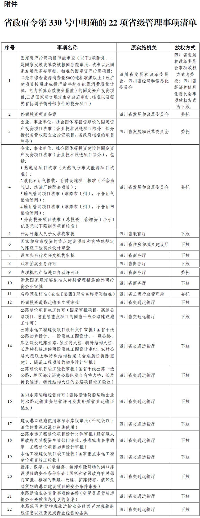 《通知》决定,将《四川省人民政府关于中国(四川)自由贸易试验区片区管委会实施首批省级管理事项的决定》(省政府令第330号)中的22项省级管理事项下放或委托宜宾临港经济技术开发区管委会实施。