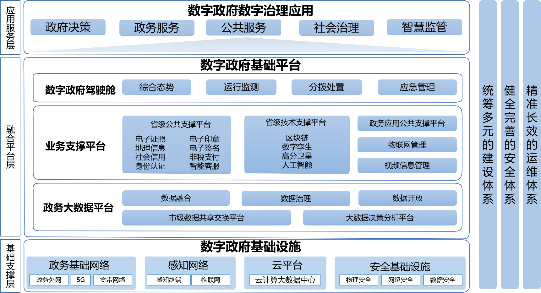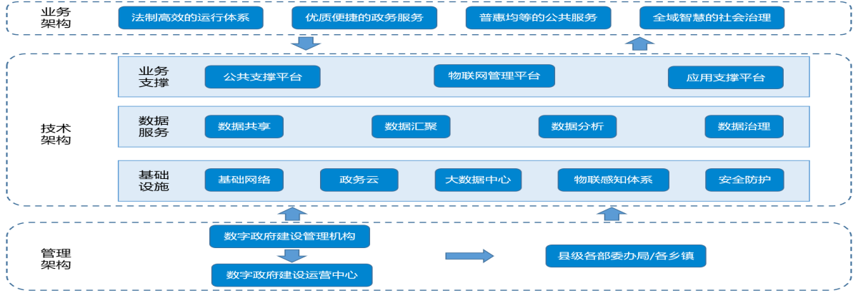 以业务协同为主线,以利企便民为导向,以精准治理为驱动,以增强基础设施能力为支撑,打造管理、业务、技术相结合的数字政府总体架构,创新政府管理和社会治理模式,推动政府运行数字化转型,加快建设服务型政府。