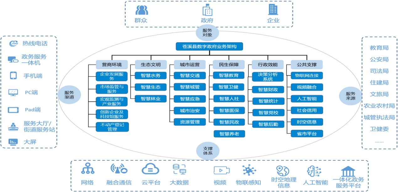 突出特色,多元参与。结合苍溪县域实际,发挥工业、农业等产业发展优势,选择适宜县域数字建设的路径与模式,促进数字政府建设与县域经济社会发展协调统一。鼓励和支持企业、社会组织和群众等多元力量参与我县数字政府建设,构建政、事、企多元参与的数字政府建设良好生态体系。