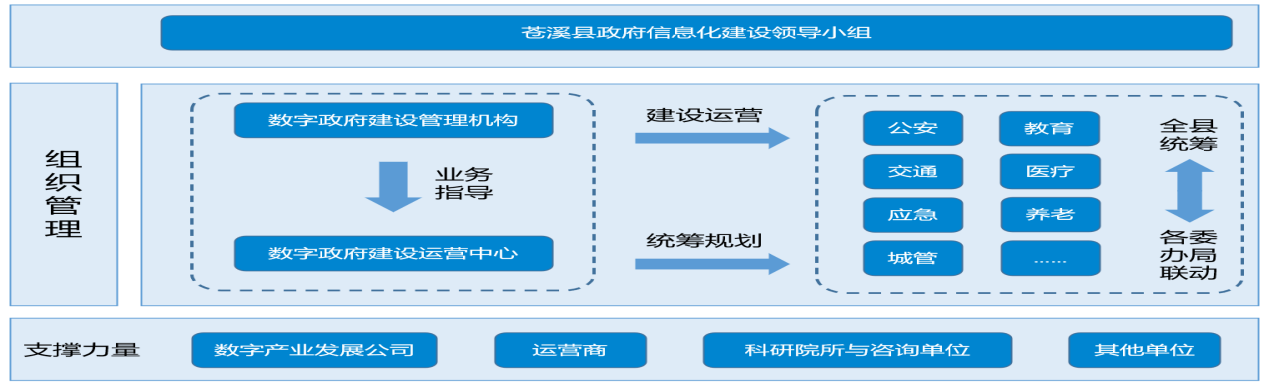 参照省、市数字政府建设组织管理体系,以“管运分离”为原则,在管理机制、运营模式、智库支撑、智库效能等方面进行创新,健全领导机制,明确管理职责,加深协同联动,构建“统一领导、上下衔接、运作高效、统筹推进”的苍溪县数字政府管理体系。