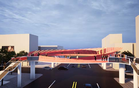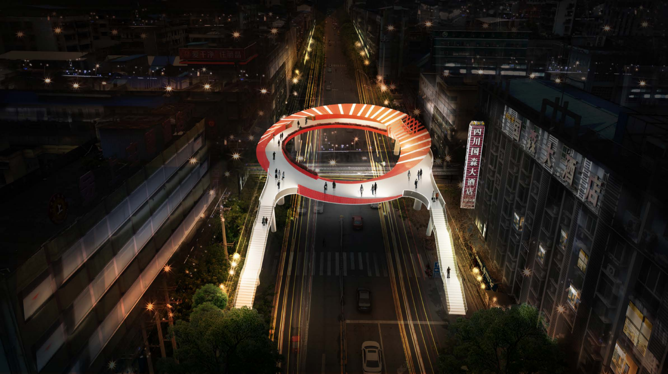天桥形态取自于猕猴桃造型,平面呈椭圆形,桥下净空4.5米。天桥在红军路方向设置4个通道(梯步);人民中街因现状人行道较窄,不符合《城市人行天桥与人行地道技术规范》相关要求,不设置通道。