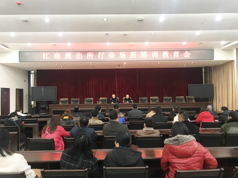 为进一步强化治安管理,推进辖区行业场所规范经营,确保辖区春节期间治安大局稳定。1月30日,江南派出所邀请治安大队联合召开了辖区内行业场所培训教育会。派出所相关负责人、社区民警及辖区内所有娱乐场所、旅馆业、烟花爆竹零售商与小区物业负责人参加。