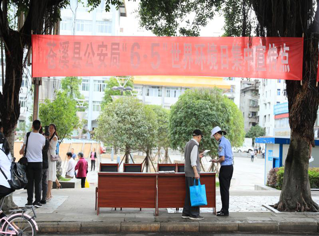 6月5日,县公安局交警大队在同心广场开展“6·5”世界环境日集中宣传活动。