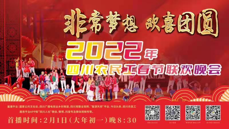 本次晚会由四川省农民工工作领导小组、四川省人力资源和社会保障厅、四川省文化和旅游厅、中国邮政集团有限公司四川省分公司联合主办。将于2月1日(大年初一)晚8:30分同步在国家公共文化云、四川观察全矩阵、“智游天府”平台、今日头条、四川农民工服务平台APP和“四川人社”微信、微博、抖音号及微信视频号等多家新媒体平台首播,2月2日(大年初二)在四川广播电视台乡村频道(SCTV—9)22:10分重播,为广大农民工送上一份“年味”十足的礼物。