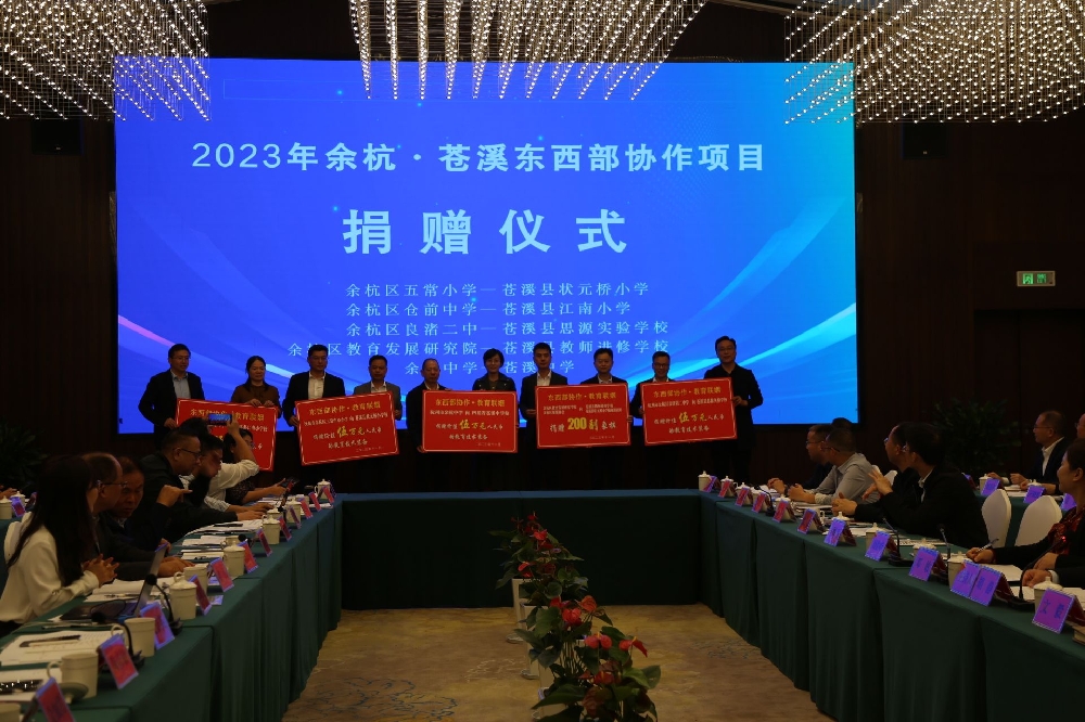 会上,我县4个名师工作室被授予余杭?苍溪东西部协作项目学科名师工作室;杭州五常中心小学、仓前中学、良渚二中、余杭教育发展研究学院和余杭象棋协会、余杭中学分别向结对的状元桥小学、江南小学、思源实验学校、苍溪县教师进修校、苍溪中学捐赠了教育教学技术装备、象棋和物理创新实验室教具等,苍溪、余杭各学校分别作了发言。