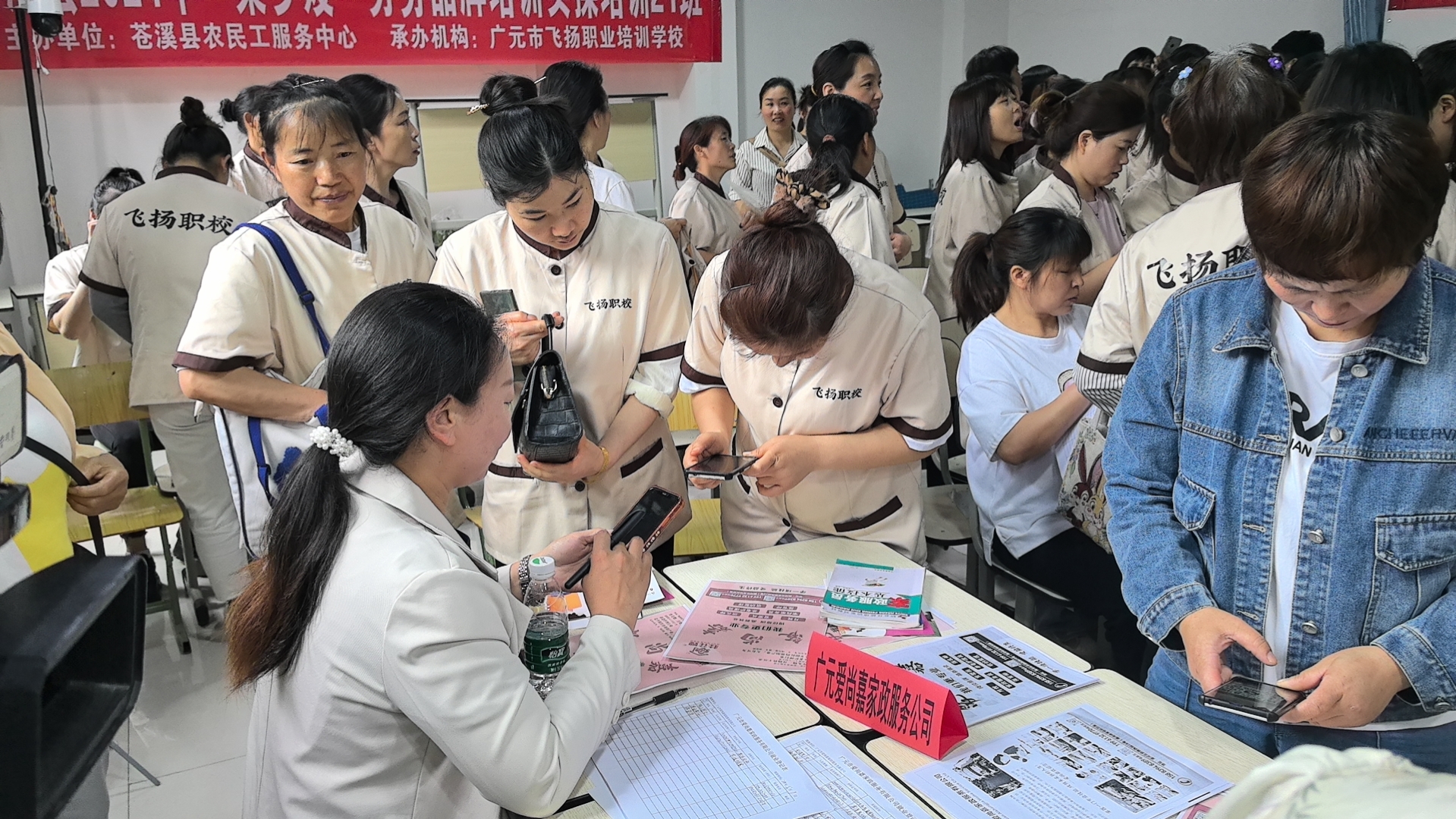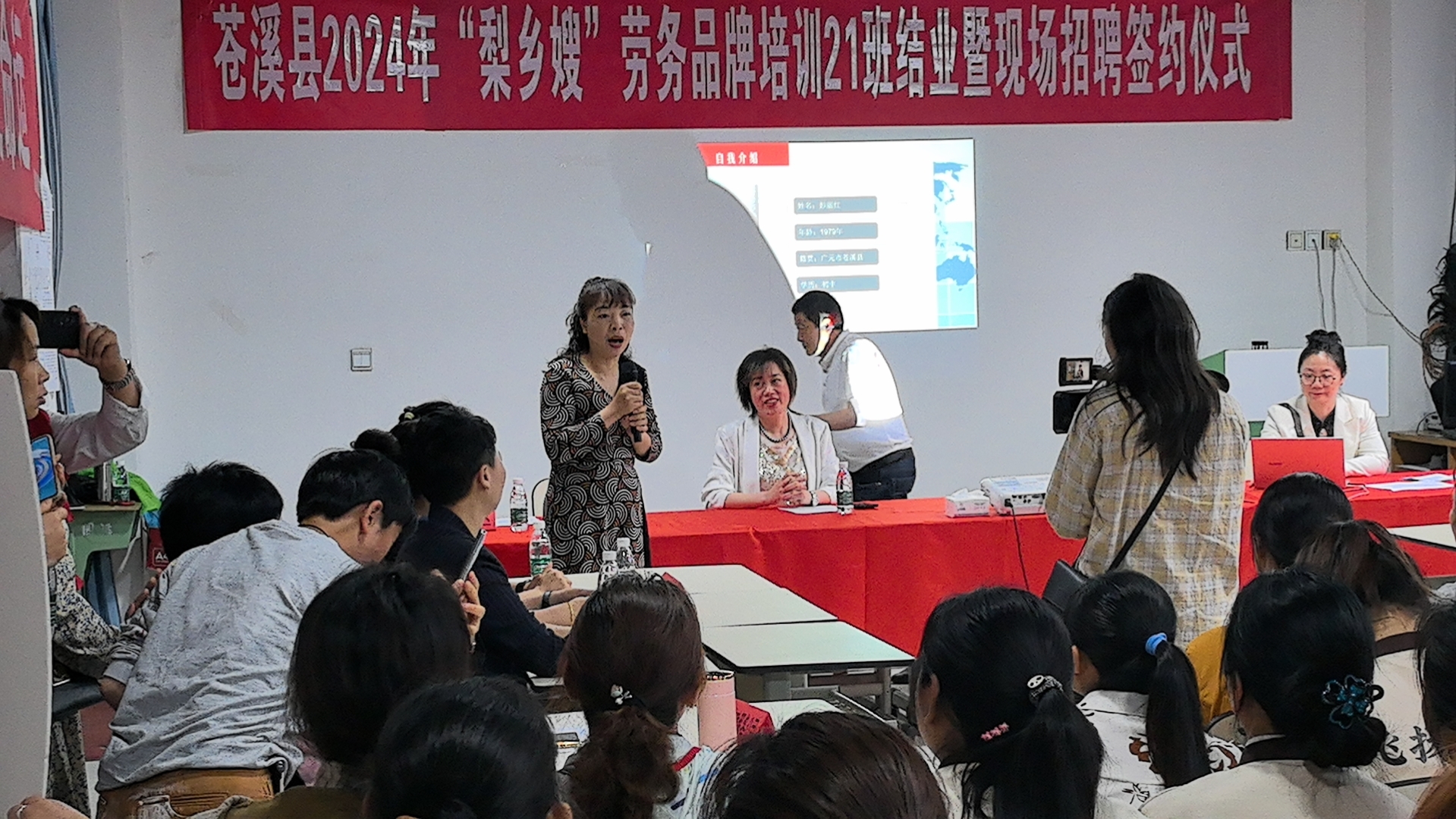 (图为苍溪县2024年“梨乡嫂”劳务品牌培训21班结业暨现场招聘签约仪式现场)