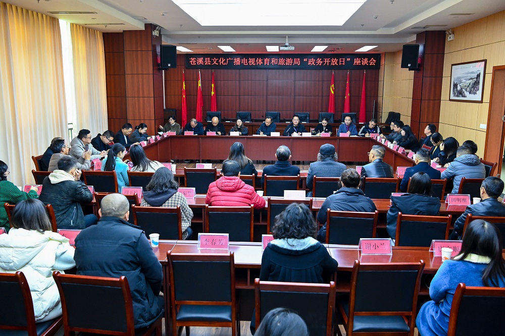 现场参观结束后,在文广中心五楼会议室召开了座谈会。会上简要介绍了县文化广播电视体育和旅游局历史沿革、职能职责、股室设置、主要业务工作推进等基本情况,并听取了受邀群众对全县文化、广电、体育和旅游工作的意见及建议。局党组书记、局长莫冬明总结了近年来文化广播电视体育旅游工作成绩,分析了当下文化广播电视体育旅游工作形势与挑战。倡导全体人员进一步关心关注全县文化广播电视体育和旅游事业,多做正面宣传,凝聚正能量。