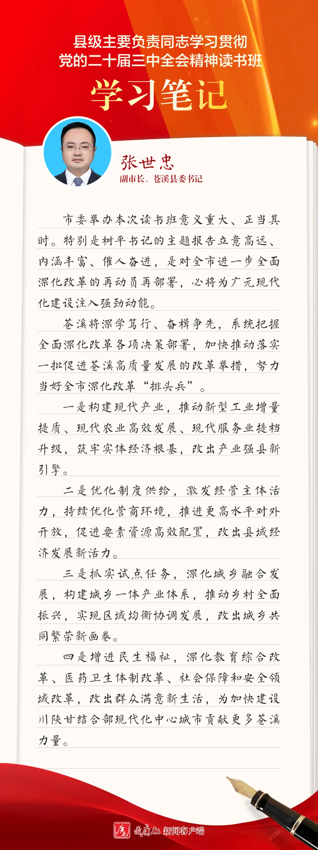 读书班学习笔记︱副市长、苍溪县委书记 张世忠:当好深化改革“排头兵” 为加快建设川陕甘结合部现代化中心城市贡献更多苍溪力量