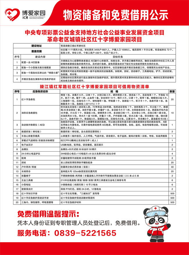 为进一步弘扬“人道、博爱、奉献”的红十字精神,完善社区应急服务体系,在2025年中央专项彩票公益金支持下,苍溪县陵江镇红军路社区红十字“博爱家园”项目正式建成并面向全体居民开放。现提供20大类便民应急物资的免费借用服务,助力构建安全、互助、和谐的幸福社区。