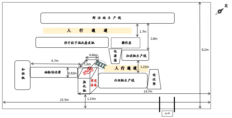 2025年9月19日13时07分,县应急管理局执法人员对事故现场进行了勘验。经现场勘验,事故发生在苍溪县陵江镇红军路下段488号漓山粮油公司厂区内挂面生产车间,该车间长23.5m,宽8.2米,车间大门朝东南方向,厂房里面有鲜活面生产线、抄手饺子混沌叠皮机、扫皮机生产线、干面制作生产线(包含和面机、面粉传送带、熟化机、复合压延机、传送架等设备)、电源箱、操作桌和一些杂物柜。鲜活面生产线机械设备距操作桌1.7m,距扫皮机生产线2.8m,扫皮机生产线距压延机生产线1.23m,和面机与熟化机之间的面粉传送带长4.7m,宽0.82m。熟化机处于压延机上方,位于面粉传送带与压延机生产线中间,熟化机周围搭建有一个钢架小平台,平台上铺有木质板,平台长2.73m,宽2.72m,高1.8m,熟化机置于平台之上,在熟化机旁有一传动电机(停机状态),旁边安装有栏杆,长2.72m,高0.85m。熟化机长1.62m,宽0.86m,深1m,高1.01m,距厂房墙面1m。由于消防进行施救,现场熟化机底部被破解,熟化机内部有明显血迹,电源箱右前方有一钢梯,长2.12m,宽0.82m,用于从地面到平台。