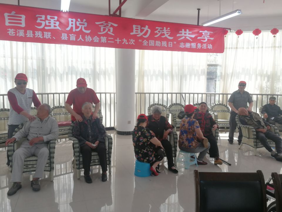 5月17日上午,苍溪县残联、县盲人协会组织5名盲人按摩师来到县社会福利院开展志愿服务活动,免费为90名住院老人按摩。