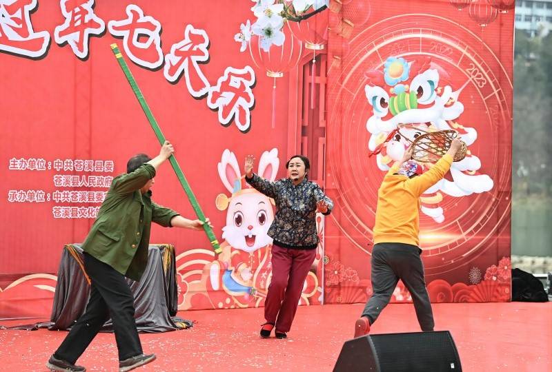 看点三:非遗节目引关注。值得特别指出的是,苍溪县拥有9项省级非遗。在本次系列展演中,省级非遗项目苍溪灯戏《竹篮记》《秀兰改嫁》《追鱼》《齐老爷断奇案》等剧目纷纷登场,行孝、扬善、勤劳致富、乡村振兴等正能量的主题,自然地融入接近川剧的苍溪“土味”唱腔、诙谐幽默而不失夸张的表演之中,散发着植根苍溪大地的泥土气息。另外,川剧绝活变脸、吐火、滚灯以及东北二人转等国家级非遗项目也纷纷登上“梨乡过年七天乐”舞台,丰富了节目形式和内容,也促进了文化对外交流。