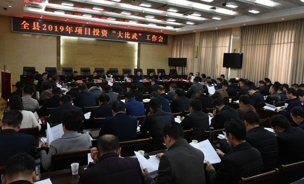 3月4日下午,我县召开2019年项目投资“大比武”工作会。县委副书记、县长杨祖斌讲话。县人大常委会主任冯明,县政协主席王天会,县委副书记李城出席会议。