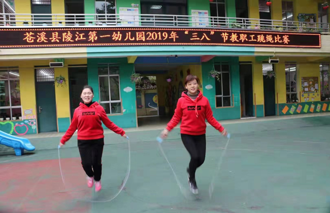 在三八节到来之际,陵江一幼为庆祝“三八“节109周年,激发广大女教师热爱幼教事业的热情,热爱生活的激情,组织全体女教师开展跳绳比赛,与家长幼儿一起开展母子感恩活动,并组织教师积极参加县妇联组织的第三届跳绳比赛,县总工会组织的“三八书香”女职工经典朗诵比赛并获二等奖。( 李玲供稿)