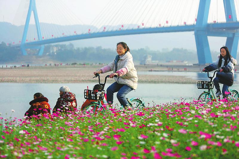 12月8日,宜宾市南溪区的长江边,市民在花海绿道开心骑游。兰锋摄(视觉四川)