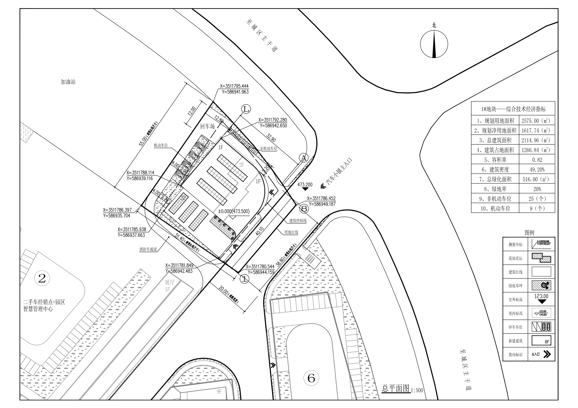 该项目一期方案由上海市建筑设计有限公司四川分公司设计,经县城乡规划暨土地及矿产资源管理委员会2019年第3次会议审查通过。规划设计主要技术经济指标为:规划建设总用地约15173㎡,一期建筑总用地12646.6㎡,容积率为0.47,建筑密度为30.58%,绿地率为20.51%,最高建筑8.85米,机动车位配置96个。布置有4条汽车检测线及1层汽车展厅1栋、2层办公办公楼1栋、1层维修车间1栋(详见附图)。