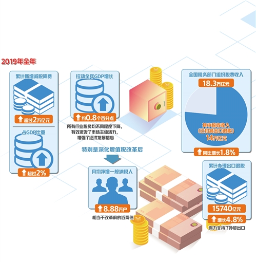 国家税务总局局长王军在会上表示,2019年全年累计新增减税降费超过2万亿元,占GDP比重超过2%,拉动全年GDP增长约0.8个百分点,所有行业税负均不同程度下降,有效激发了市场主体活力,增强了经济发展信心。特别是深化增值税改革后,月均净增一般纳税人8.88万户,相当于改革前的近两倍。