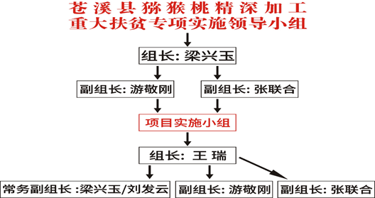 领导小组组长梁兴玉:全面负责“苍溪县猕猴桃精深加工重大扶贫专项”项目工作,指导、协调、督促领导小组成员认真履行工作职责,对运行过程中的重大问题做出决策,确保项目工作落到实处,取得实效。