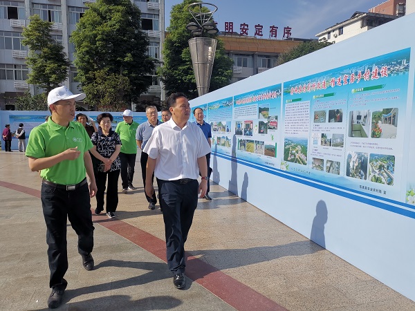 杨祖斌一行先后参观了宣传展板和相关部门宣传咨询点,观看了我县近年来生态环境保护成果专题片。