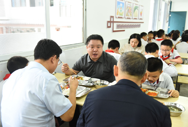 图为,县委副书记、代县长任云在状元桥小学食堂体验学生营养餐。