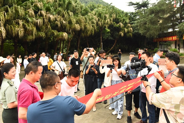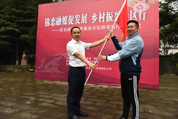 启动仪式上,谢龙飞还为“猕恋融媒——重走长征路苍溪行活动”进行了授旗。