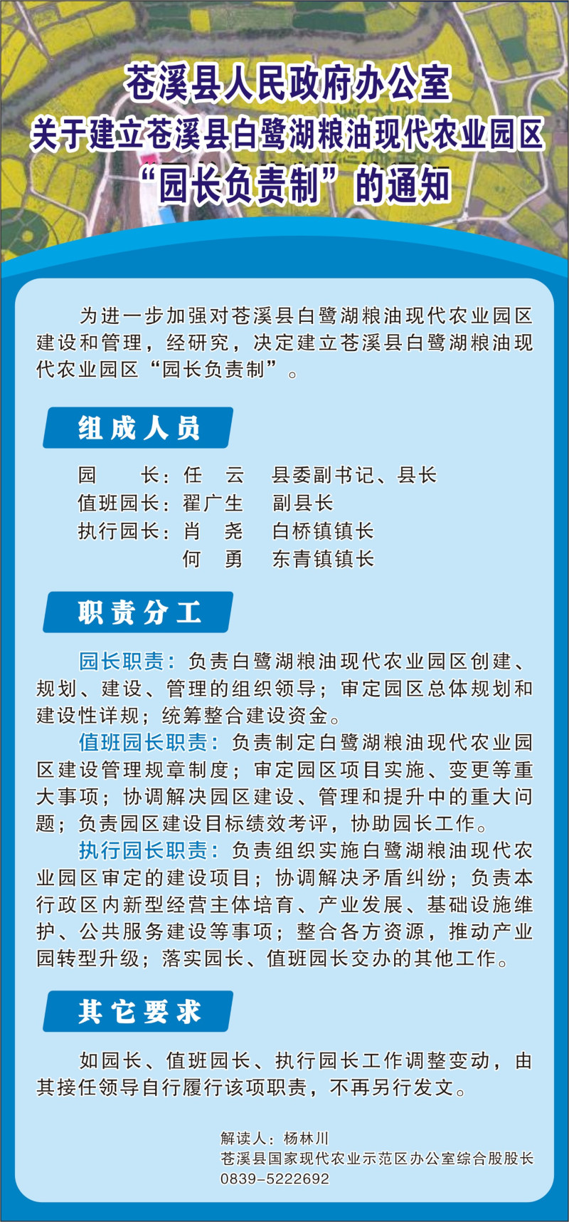 图解:苍溪县人民政府办公室关于建立苍溪县白鹭湖粮油现代农业园区“园长负责制”的通知