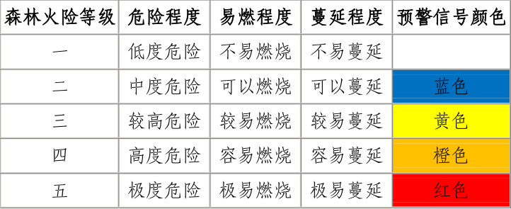 森林火险按照森林可燃物的易燃程度和蔓延程度,通常划为五个等级,依次为一级(低度危险)、二级(中度危险)、三级(较高危险)、四级(高度危险)、五级(极度危险)。