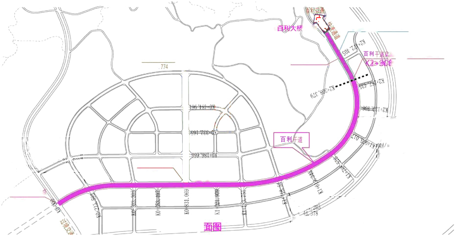 百利新区主干道呈东西走向,西与规划的过境通道相接(胡家梁村1组,张家湾),东与在建的百利大桥南桥头互通相接,全长2.47千米,宽40米,双向6车道,命名为“百利干道”。