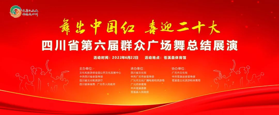 该活动由文化和旅游部全国公共文化发展中心、中共四川省委宣传部、四川省文化和旅游厅、四川省体育局、广元市人民政府主办,以“舞出中国红 喜迎二十大”为主题,运用音乐歌舞,融合运动健康,广泛发动参与,让基层群众深切感受百年党史辉煌历程,由衷表达对新时代幸福美好生活的真情实感、对中华民族伟大复兴中国梦的热切期盼。