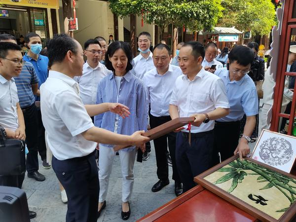 在朝天区曾家镇特色文化街区,全市四县三区的优秀文化成果应邀亮相,展示内容涵盖各区县本地非物质文化遗产、特色文化产品、商品和特色美食。在我县特色文化展示点位,红心猕猴桃饮品、果脯、酵素、魔芋凉皮、雪梨膏、唤马剪纸等文化产品吸引了众多过往游客驻足观看。县委常委、宣传部部长谢龙飞现场向参观人员介绍了我县非物质文化遗产——唤马剪纸的历史起源、文化价值和市场前景,得到了与会人员一致好评。同时,县电商中心主播也通过手机直播的方式向网友介绍我县特色产品的种类、制作方式和功能价值,同步进行网络订单销售和现场直售。