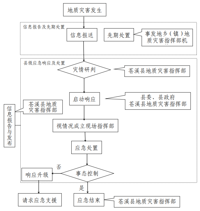(1)县抢险救灾指挥部及时向市委、市政府和市应急管理局、市自然资源局报告灾情和应急处置工作进展情况,按照上级领导指示批示要求,统一部署开展应急处置工作;视情请求市委市政府和市级有关部门给予援助。