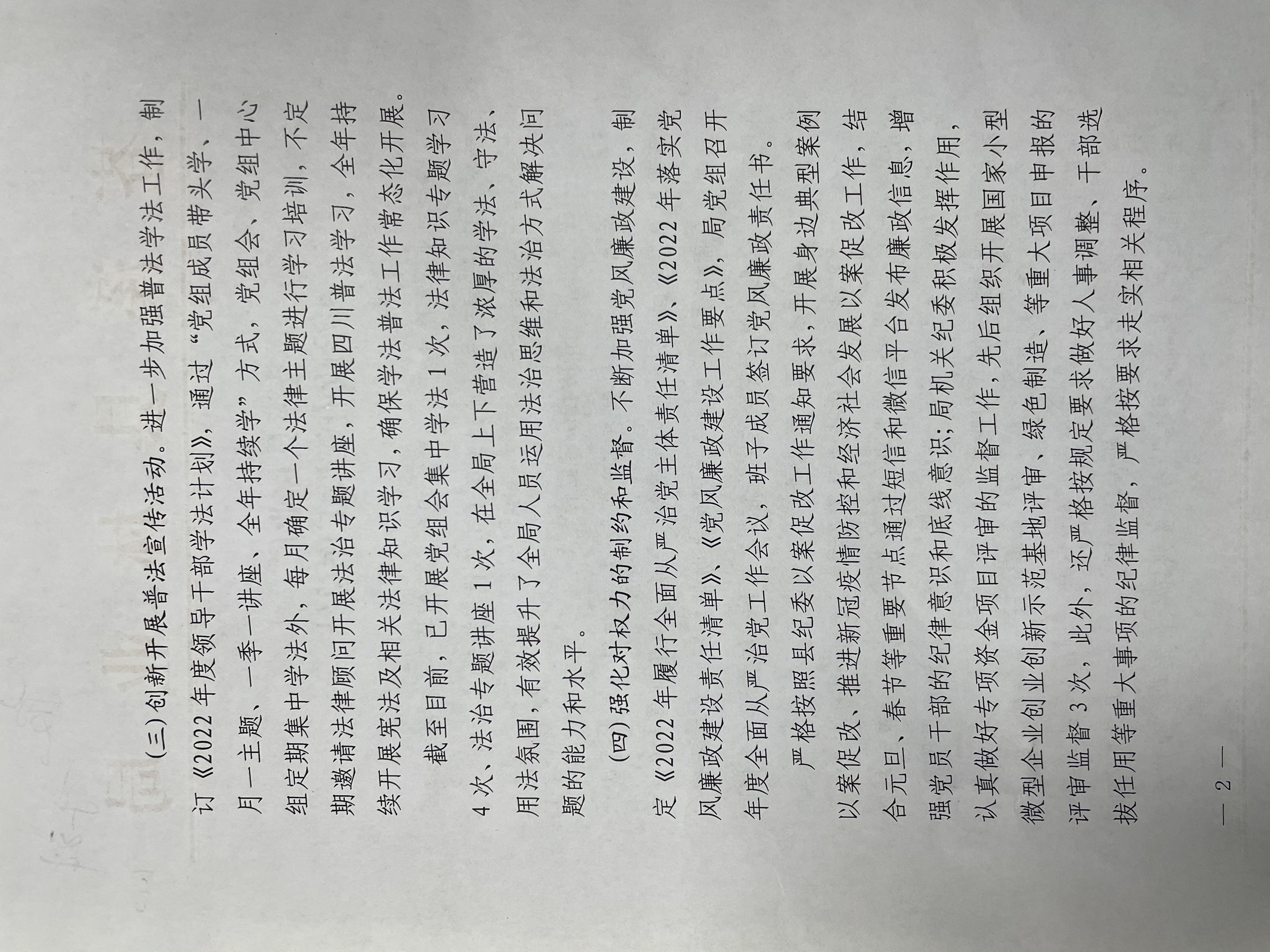 (三)创新开展普法宣传活动。进一步加强普法学法工作,制订《2022年度领导干部学法计划》,通过“党组成员带头学、一月一主题、一季一讲座、全年持续学”方式,党组会、党组中心组定期集中学法外,每月确定一个法律主题进行学习培训,不定期邀请法律顾问开展法治专题讲座,开展四川普法学习,全年持续开展宪法及相关法律知识学习,确保学法普法工作常态化开展。