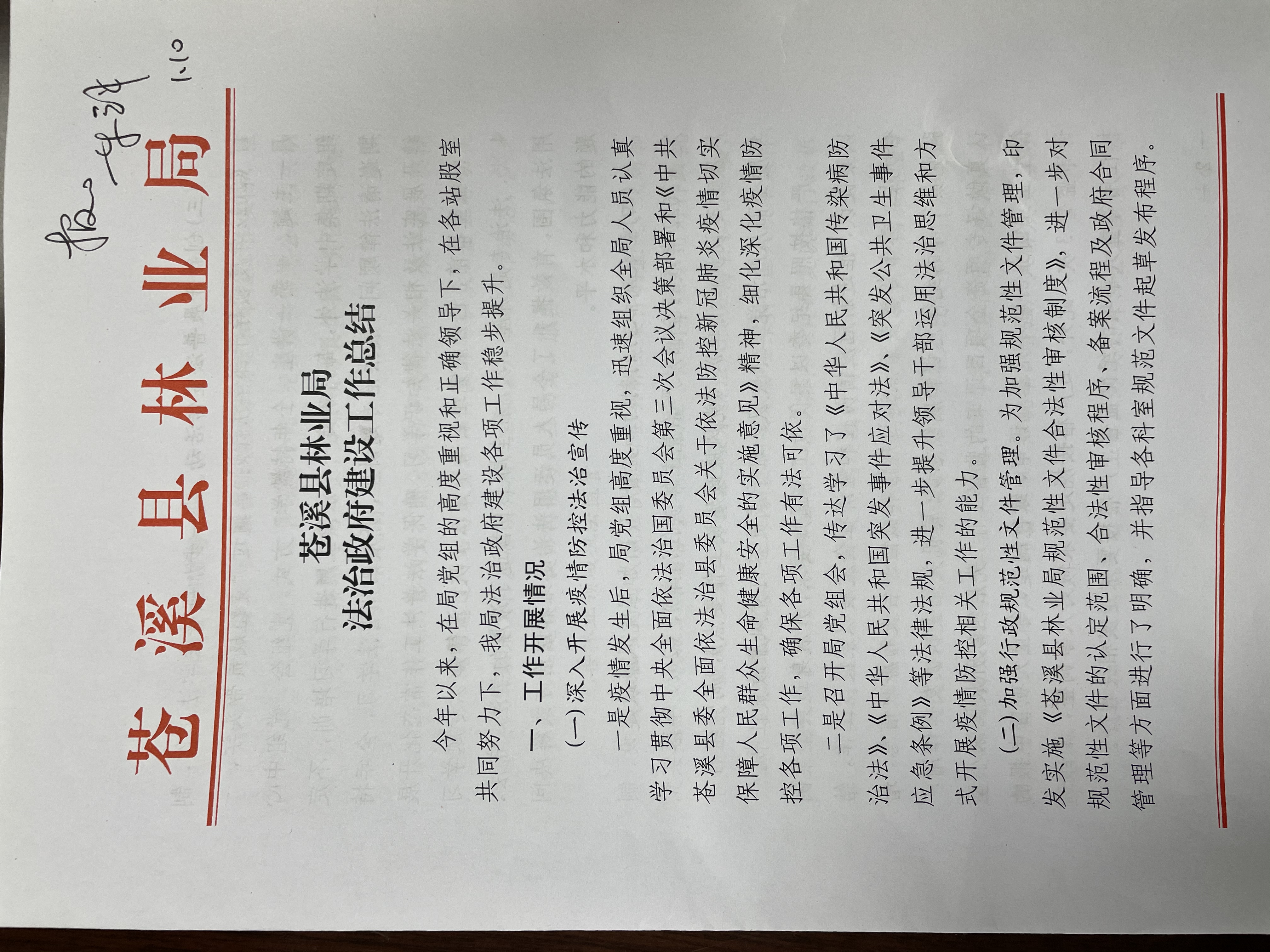 (二)加强行政规范性文件管理。为加强规范性文件管理,印发实施《苍溪县林业局规范性文件合法性审核制度》,进一步对规范性文件的认定范围、合法性审核程序、备案流程及政府合同管理等方面进行了明确,并指导各科室规范文件起草发布程序。