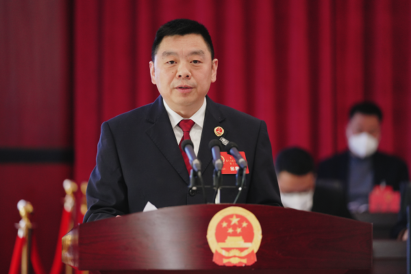 图为,县委副书记、县长任云代表县人民政府作政府工作报告。
