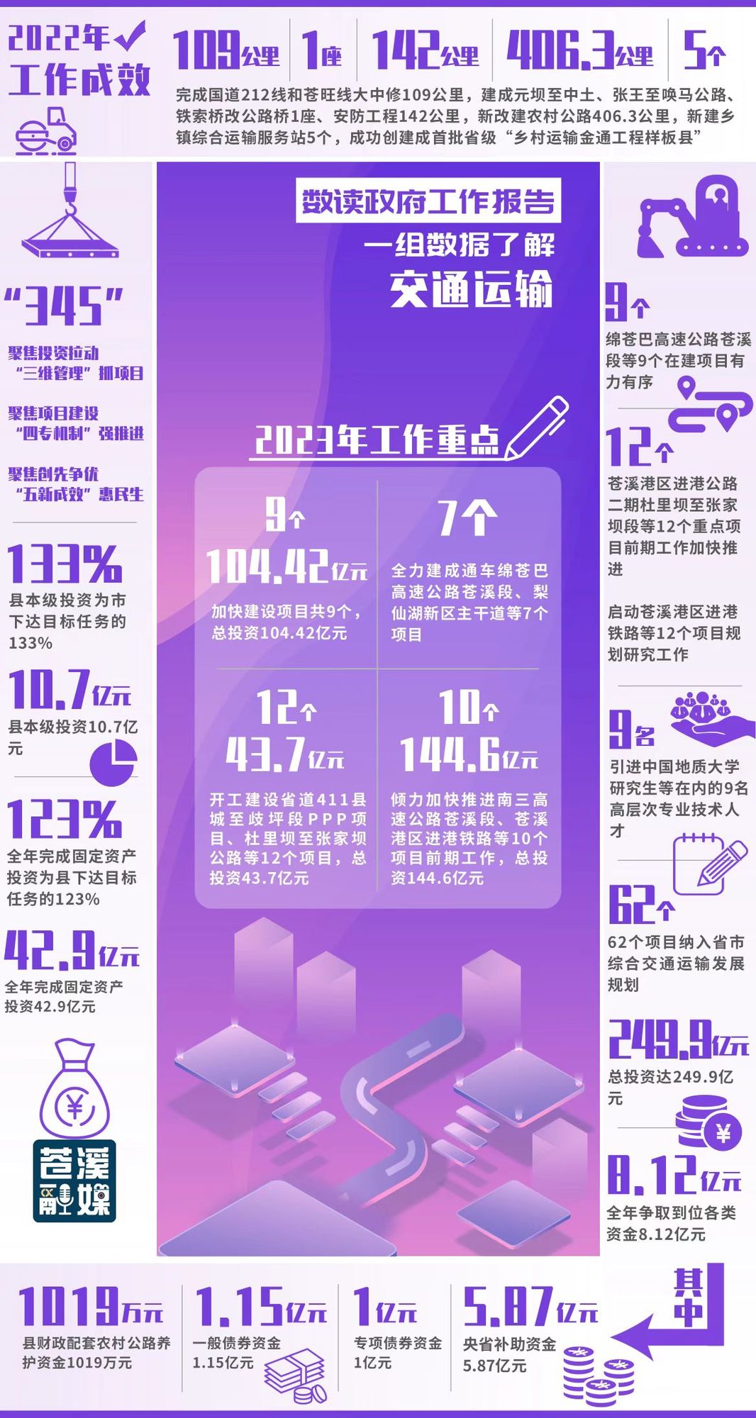 2023年苍溪县人民政府工作报告中提出,要在实施乡村振兴上争先领先。交通运输作为国民经济重要的基础性、先导性、战略性产业和服务性行业,在实现乡村“产业兴旺、生态宜居、乡风文明、治理有效、生活富裕”中发挥着重要作用,是实现巩固拓展脱贫攻坚成果同乡村振兴有效衔接的基础支撑和先决条件。修好一条公路,带动一片产业,致富一方百姓。一组数据,带你了解苍溪县交通运输领域工作。