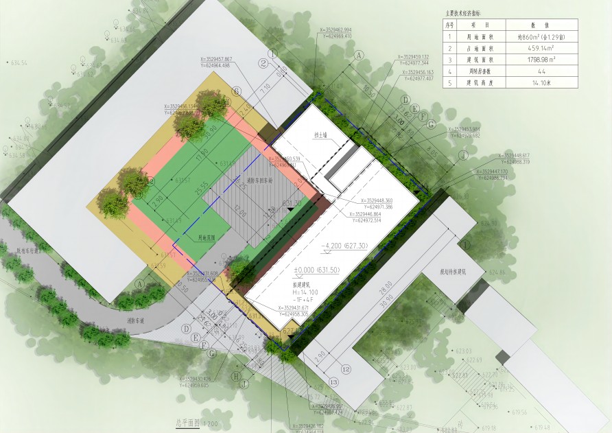 本次报送的设计方案由四川慧源鹏程工程设计有限公司设计,经县国土空间规划专业委员会2023年第6次会议审议通过。主要技术经济指标为:规划建设用地面积约860㎡(合1.29亩)。该地块拟建1栋教师周转房,地下1层,地上4层,高度14.10米。该拟建建筑总建筑面积1798.98㎡,其中地上建筑面积1515.31㎡,地下建筑面积283.67㎡。该建筑采用简约朴实风格,屋面采用平屋面形式,立面材质选用外墙真石漆,立面主体处理以黄色为主色调,局部采用浅蓝色。