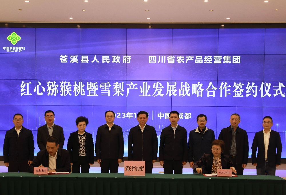 随后,苍溪县人民政府与四川省农产品经营集团举行了红心猕猴桃暨雪梨产业发展战略合作签约仪式。双方将围绕苍溪红心猕猴桃、苍溪雪梨等优质特色农产品,在标准化园区建设、种植科技支持、产品产销对接等方面展开深度合作,进一步拓宽苍溪优质农产品出山进城入户渠道,推动苍溪特色产业高质量发展。
