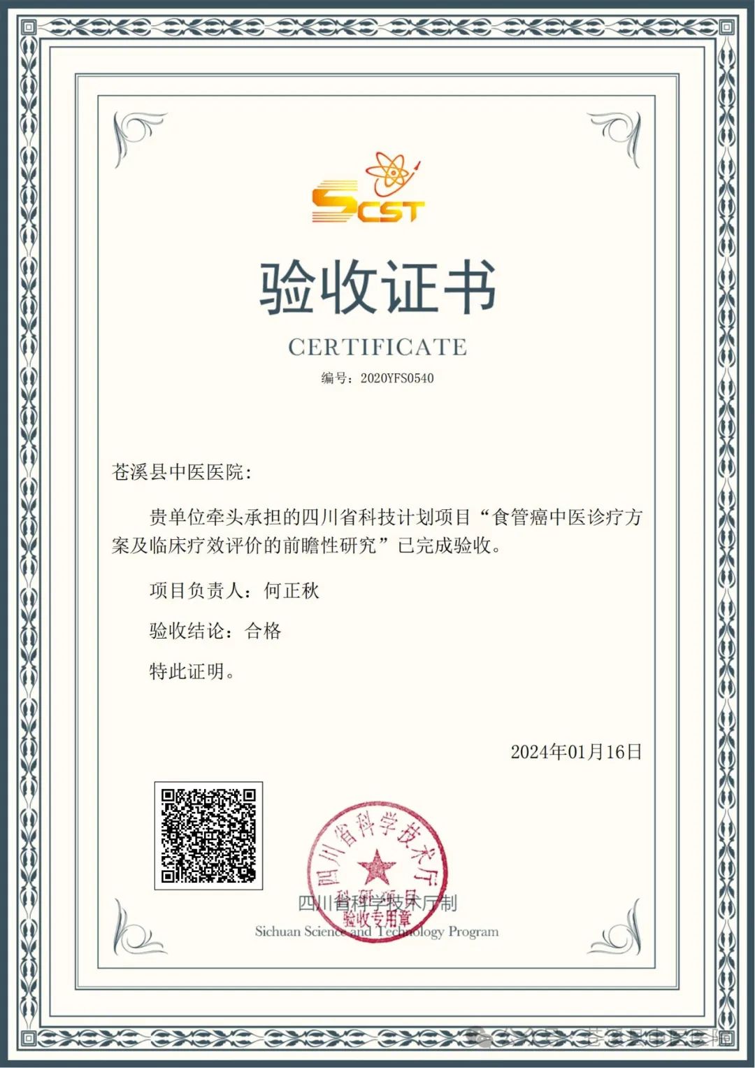 近日,由苍溪县中医医院肿瘤团队承担的省级重点科研项目“食管癌中医诊疗方案及临床疗效评价的前瞻性研究”顺利通过四川省科技厅结题验收。